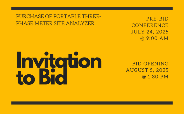 Iloilo I Electric Cooperative Inc. (ILECO I) through its Bids and Awards Committee (BAC), invites interested bidders to participate in the Public Bidding of the Project, “Purchase of Portable Three-phase Meter Site Analyzer” in accordance with the Republic Act (RA) 10531 and RA 9184 and its Revised Implementing Rules and Regulations.